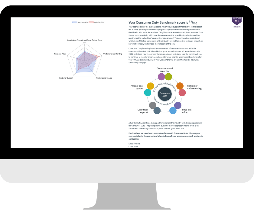 Altus Consulting has been helping clients to develop a compliant approach and mature their capabilities related to Consumer Duty, which is a complex task under the principles and outcomes-based approach. If you want to discuss your results from the Self-assessment tool, or your approach to Consumer Duty, please contact us