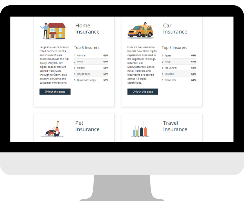 Access up-to-date dashboards, ranking tables and data visualisations to gauge digital capabilities and user experience metrics. Compare capabilities across multiple product areas and see brands’ digital servicing coverage across the insurance lifecycle.