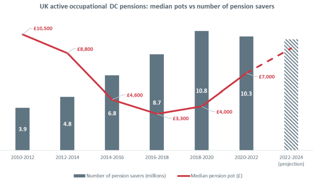 A decade ago, the UK’s pension system changed forever as auto-enrolment brought millions of people into pension saving for the first time. The numbers soared, but for years, median pension pots dropped as a wave of new savers entered the pension system for the first time with zero balances. That phase is now firmly over. Between 2018-20 and 2020-22, the median pot increased by £3,000 to £7,000—the first meaningful sign of that we are in a phase of growing accumulation rather than just growing participation.