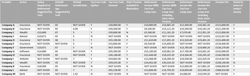 - Providers chosen from a list of returns from the Google Query Search “Pension Illustration Tool” choosing UK providers only and selecting only providers offering an open service with no registration required.