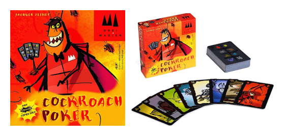 Cockroach Poker – It’s not really anything like traditional poker, but there is a lot of bluffing involved. The idea is to pass cards around the table, trying to get other players to pick them up, whilst not collecting too many yourself. Someone’s passed you a card and claims it’s a Toad. Do you believe them? Do you call their bluff? Or do you take a peek at it then try to fob it off onto someone else? The first player to collect 4 identical cards loses – and everyone else wins! What’s not to like about a game with so many winners? Unless you’re the one loser… The card art is quirky and fun (unless you’re scared of SPIDERS!) and is suitable for kids and adults alike.