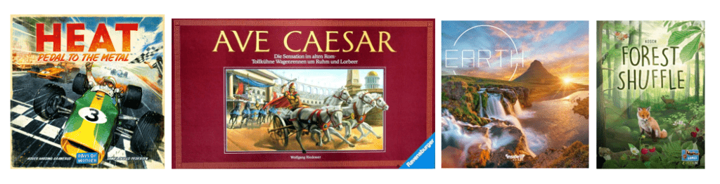 The number one racing game continues to be Heat: Pedal to the Metal (up to 6 players, 60-90 minutes), with the much simpler Ave Caesar (up to 6 players, 30-45 minutes) a close second. If you want an environmentally themed game, then Earth (up to 5 players, 2-3 hours), is a game about building a flourishing ecosystem, using cards that synergise with each other to grow the flora on your island. Whereas the simpler Forest Shuffle (up to 5 players, 60-90 minutes) concentrates on just one forest and its inhabitants.