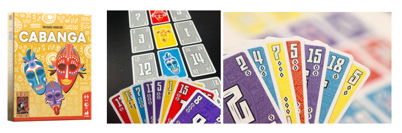 Cabanga – another simple card game. This time you’re trying to ditch cards from your hand onto one of the central piles, but without pickup penalties along the way. When a player has no more cards in hand, the round ends and all players count the points on their cards. As soon as a player has collected 18 points, the game ends and the player with the fewest points wins. It plays up to 6 players and takes about 20 minutes.