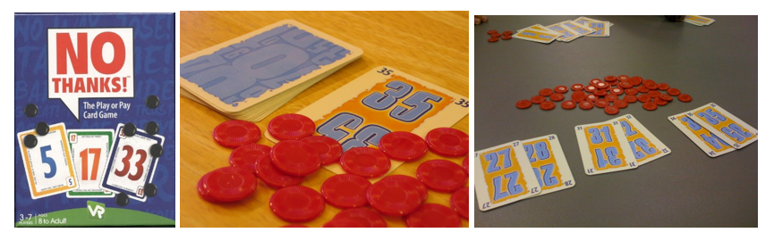 No Thanks! – The rules are simple. Each turn, players have two options; either play one of their chips to avoid picking up the current face-up card or pick up the face-up card (along with any chips that have already been played on that card) and turn over the next card. Picking up cards is bad, unless you can form a run of numbers; then it’s good. You have a limited supply of chips, but you can get more my picking up unwanted cards. If you can collect a sequence of numbers, then you only score the lowest number. The player with the lowest total wins the game.